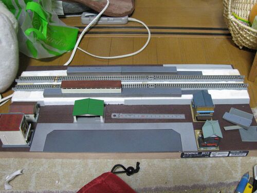 作成メ切と残作成日数を考えるとすごく悲しくなるのですが、 一応作業は続けています。 駅前の道路と歩道を作成して、築堤部にはブロックを積み板を貼って、 ホームを並べてみて、延長部分を作成。 これで18m車が3両は停まれる様子 こう見ちゃうと、やっ…